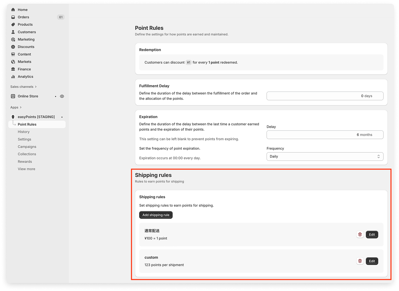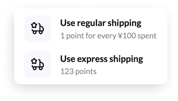 - Point rule per currency (e.g. 1 point per ¥100 of shipping)