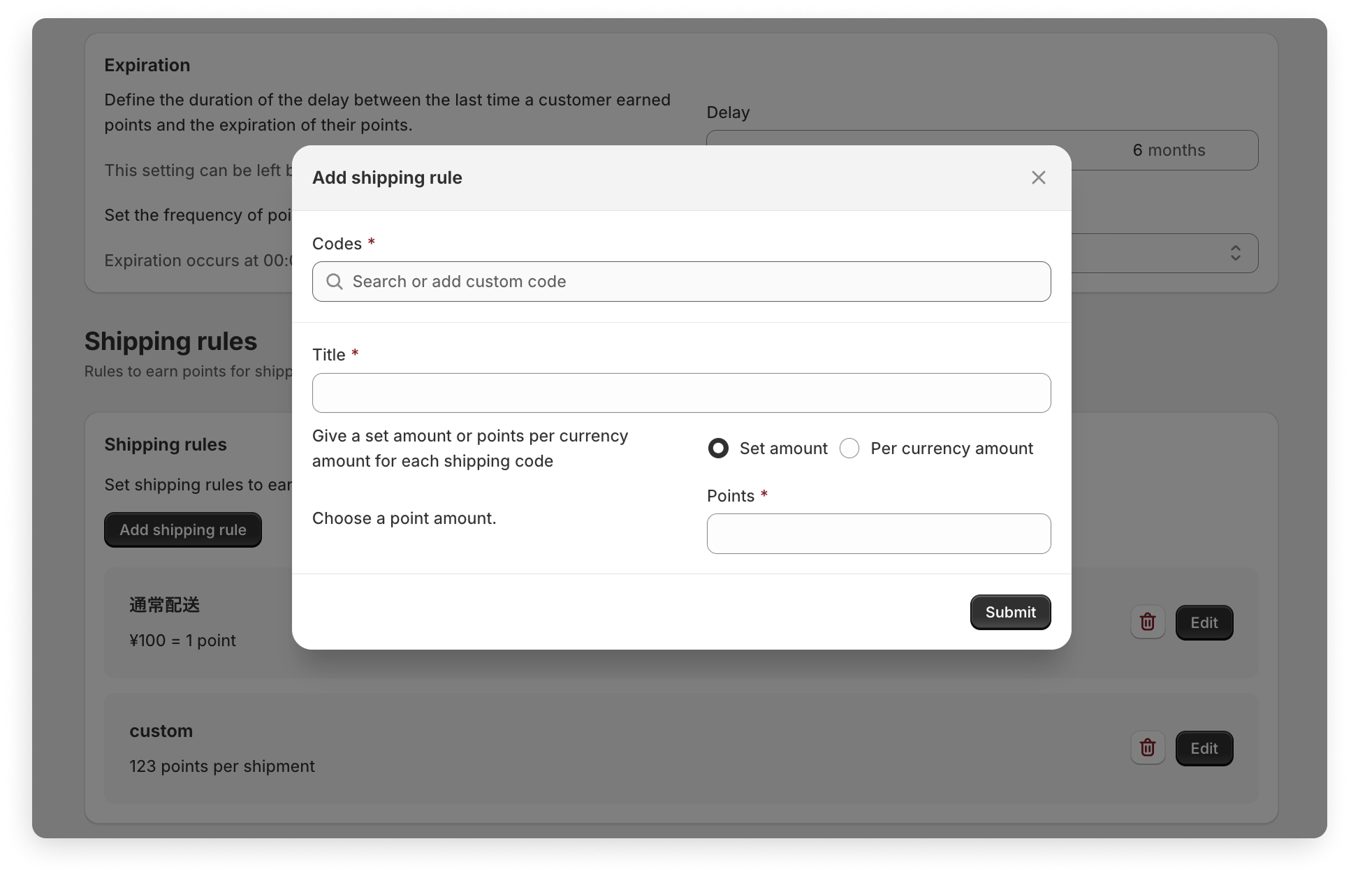 Since shipping fees are managed independently on Shopify, you must set them up separately from order-based points. As of October 2025, it is not possible to configure different settings for each tier.