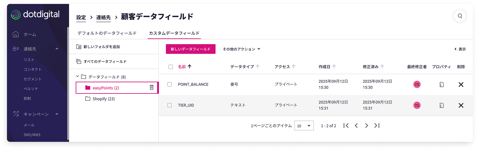 dotdigitalの設定から「コンタクト」→「顧客データフィールド」→「カスタムデータフィールド」を選択します。