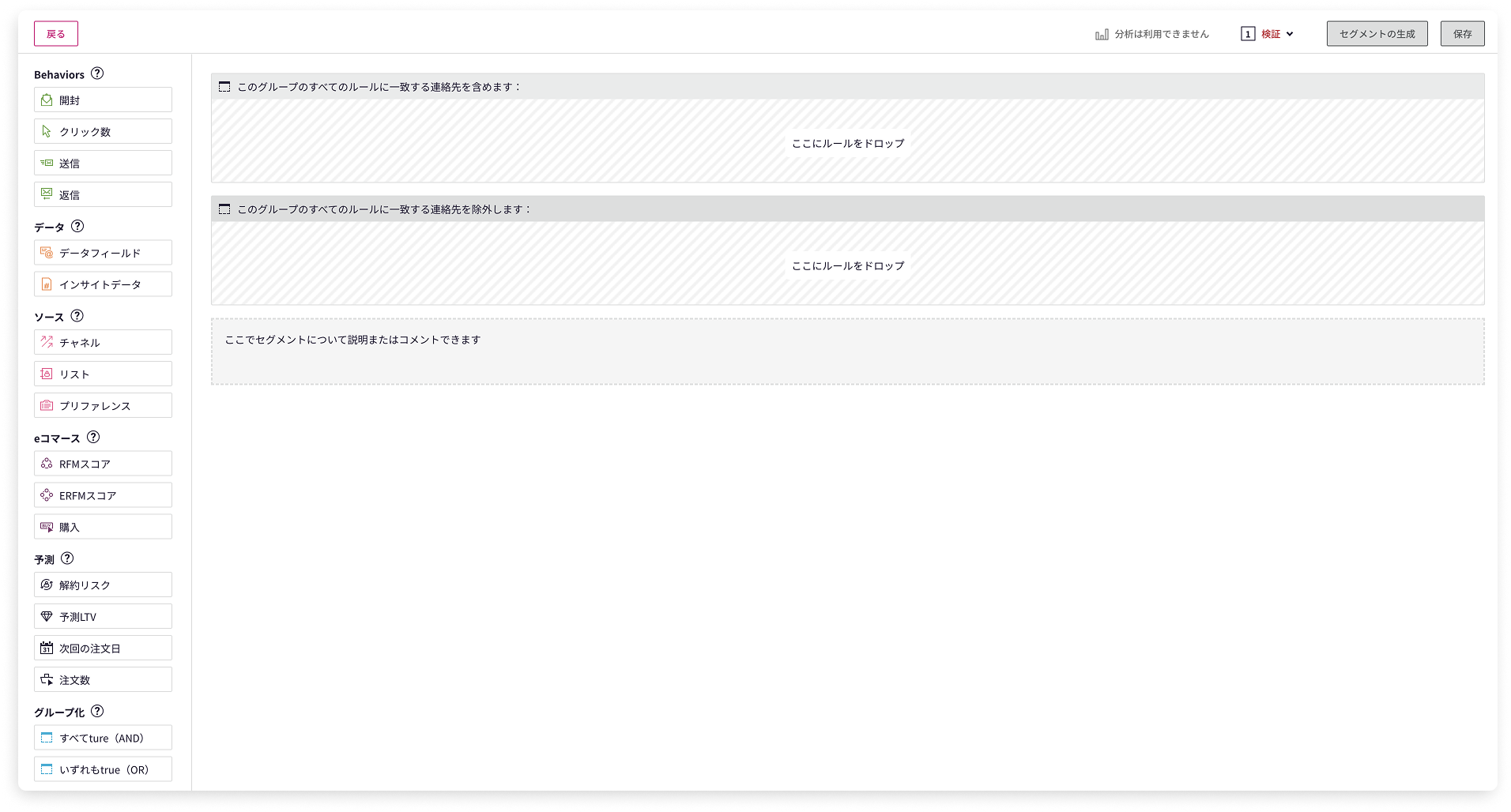 左側のメニューから条件として利用したい内容を右側のルール項目にドラッグすることで詳細に設定が可能です。保存を行うことでセグメントの作成が完了し、該当するアカウントが抽出されます。
