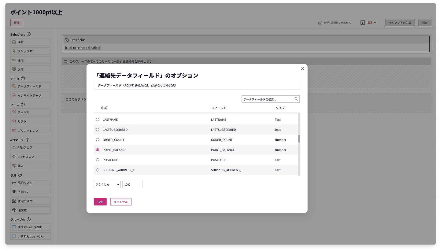 など条件と数値を組み合わせたものを設定いただくことでポイント残高の状況に応じた様々なセグメントが作成可能です。