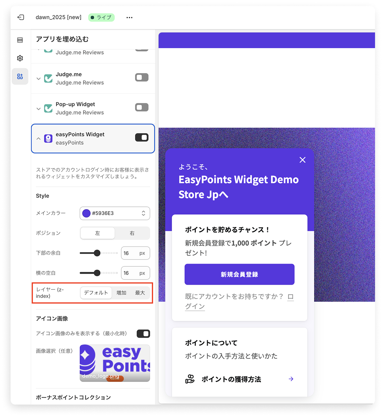 カスタマイズ画面内の「埋め込みアプリ」→「easyPoints Widget」内の「レイヤー (z-index)」から設定を変更可能です。