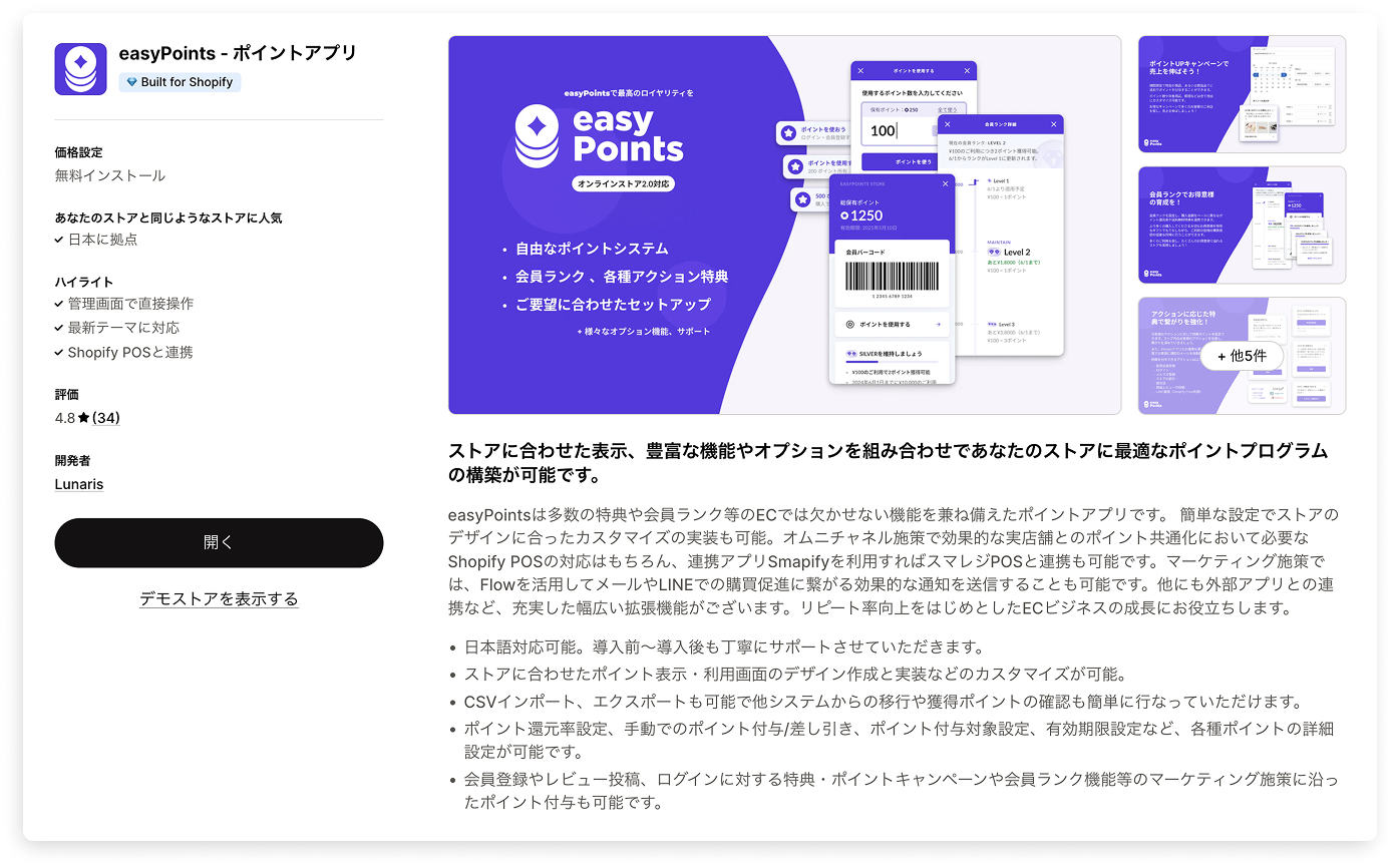 Shopify POSやスマレジPOSとの連携が可能で、実店舗との共通ポイントシステムを運用可能です。